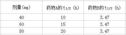 今有A、B两种不同药物,给一位病人静脉注射,测得其剂量与半衰期数据如下。请问下列叙述哪一项是正确的()