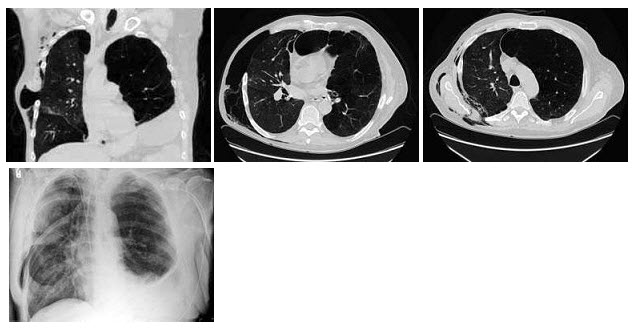 - E: 右侧肺间质病变、左侧肺气肿
