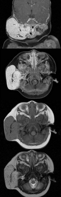 老年患者,右侧面部肿胀,呈青紫色,MRI检查如图所示,请选择最可能的诊断()A: 血管瘤B: 囊肿C: 脓肿D: 神经纤维瘤E: 神经鞘瘤